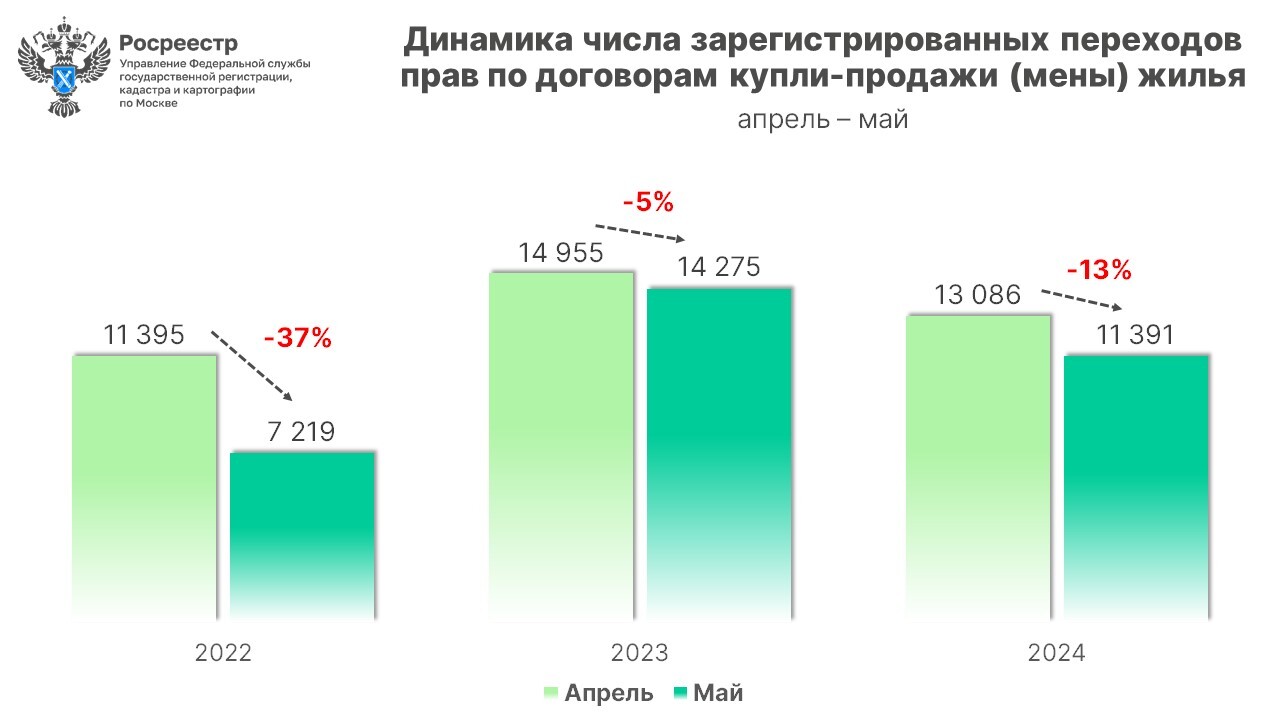 По словам руководителя управления Росреестра по Москве Игоря Майданова, результат мая текущего года почти на 13% меньше показателя апреля текущего года, когда было зарегистрировано 13,0 тыс. переходов прав. "Аналогичная ситуация наблюдалась и в предыдущие годы. Например, если смотреть на показатели мая с 2020 года, то по отношению к апрелю количество сделок (на вторичном рынке — ТАСС) ежегодно снижается в среднем на 21%", — приводит пресс-служба его комментарий.